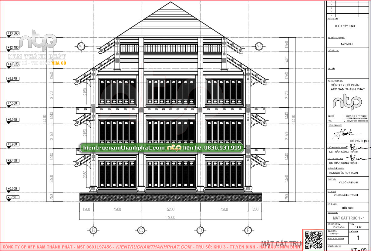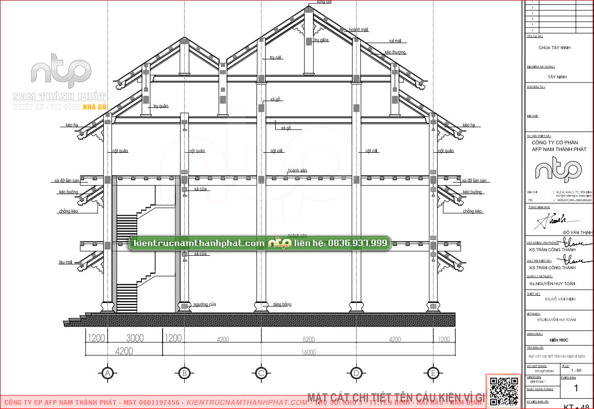 Mặt cắt bên của ngôi chùa giúp quan sát rõ kết cấu liên hoàn từ tầng 1 lên tận mái. Hệ thống xà gỗ liên kết đồng bộ với các hàng cột xuyên suốt, tạo thành một khung chịu lực thống nhất. Cầu thang gỗ bố trí hợp lý, kết nối từ tầng 1 lên tầng 3, đảm bảo sự thuận tiện trong di chuyển mà không phá vỡ bố cục tổng thể.