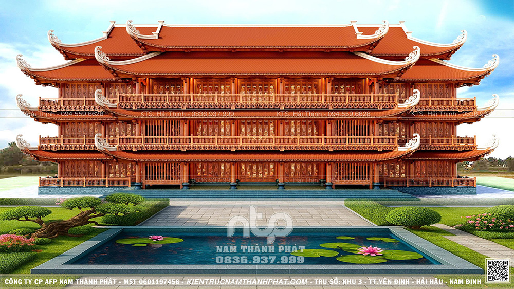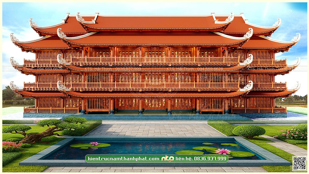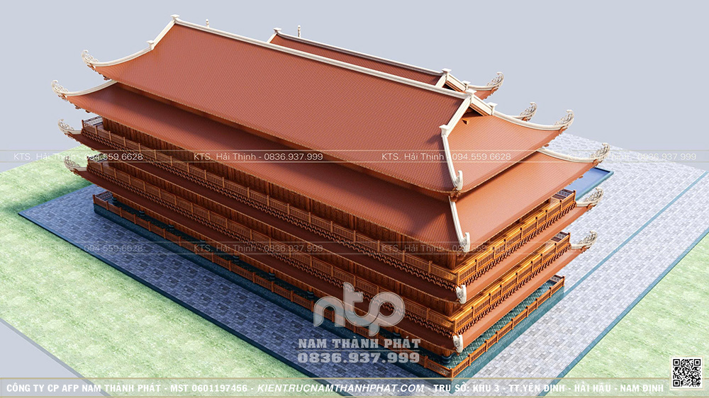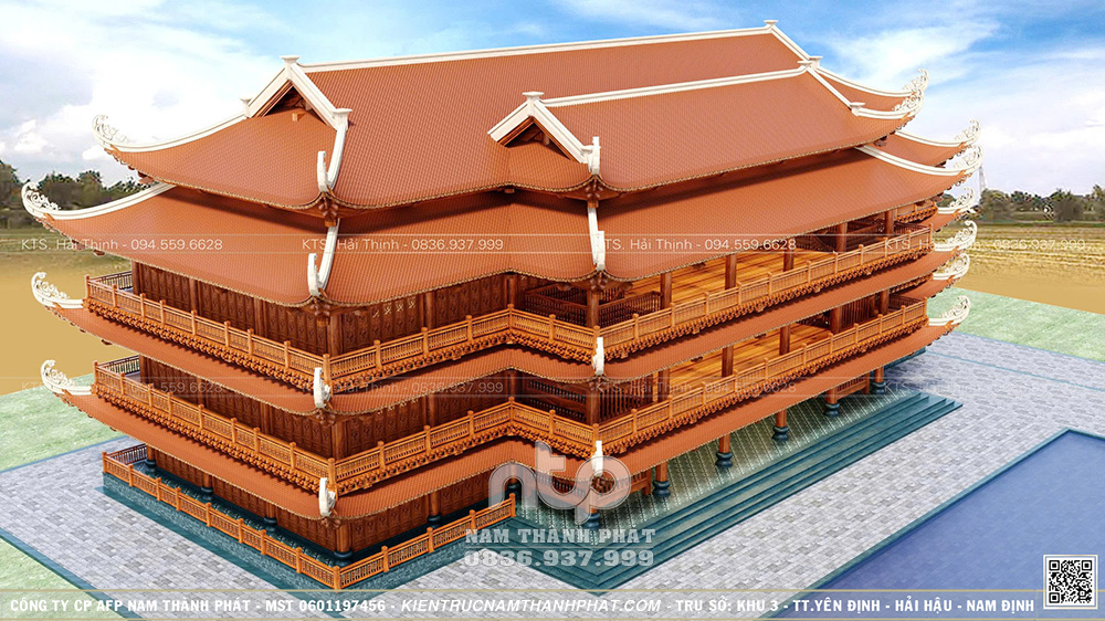 Phối cảnh 3D tái hiện trọn vẹn vẻ đẹp uy nghi của ngôi chùa gỗ 9 gian chồng diêm 3 tầng. Tông nâu cam trầm ấm của gỗ tự nhiên kết hợp cùng hệ mái ngói đỏ au tạo nên tổng thể hài hòa, vừa trang nghiêm vừa gần gũi. Các lớp mái chồng diêm xếp tầng lớp lang, mang dáng dấp kiến trúc Phật giáo cổ truyền, nhìn xa đã thấy thế đứng bề thế, vững chãi giữa không gian tâm linh.