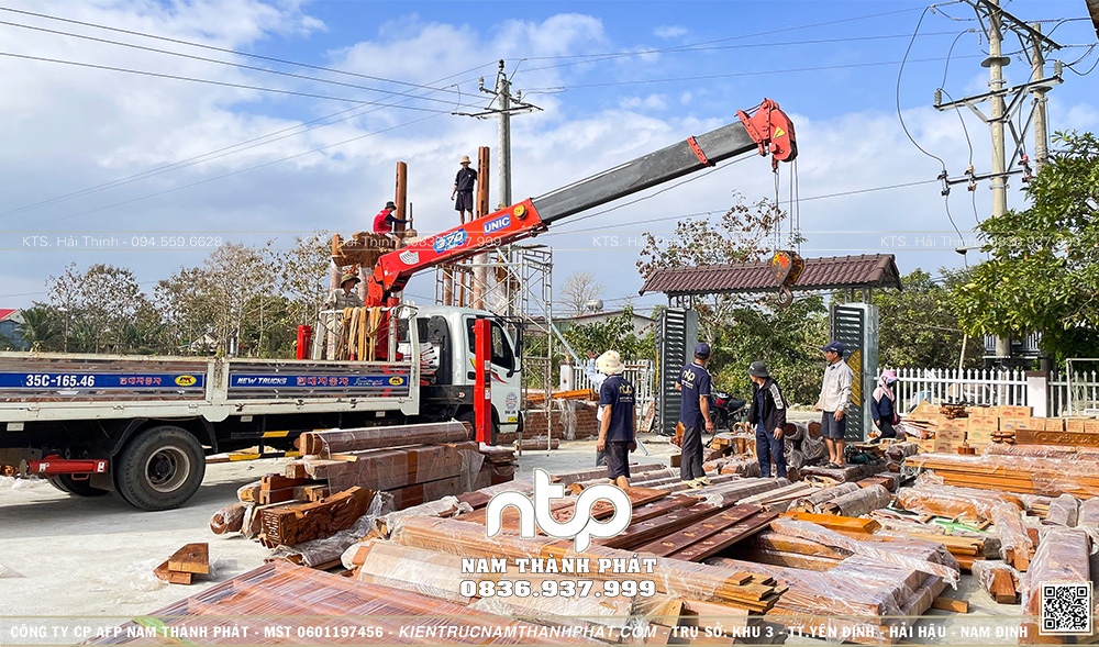 Sau hành trình vượt hơn 1.500km, toàn bộ cấu kiện của ngôi Lầu Tứ Giác cùng đội ngũ thợ lành nghề Nam Thành Phát đã có mặt tại chân công trình ở Lâm Đồng. Công tác dỡ cấu kiện được triển khai tức thì, từng chi tiết được đưa xuống đúng vị trí đã định sẵn, sẵn sàng cho màn lắp dựng.