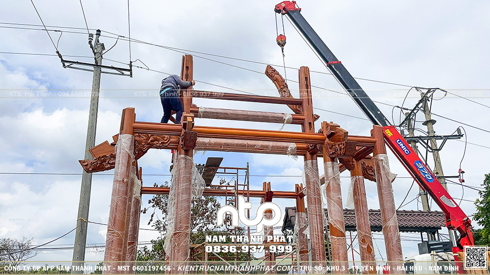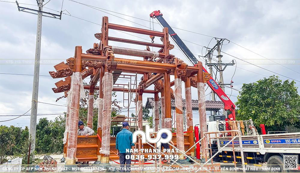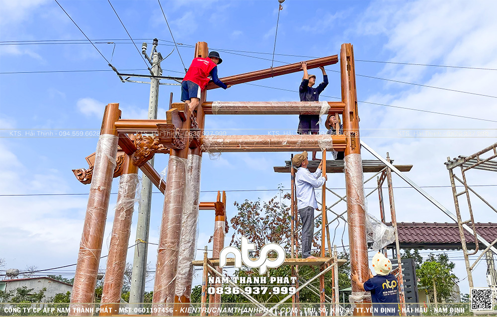 Chỉ trong chưa đầy 1 ngày làm việc, toàn bộ khung Lầu Tứ Giác đã được lắp dựng hoàn chỉnh. Đây là một cột mốc quan trọng, đánh dấu sự thành công của quá trình chuẩn bị kỹ lưỡng từ khâu phạt mộc, gia công đến lắp thử tại xưởng. Công trình sẵn sàng bước sang giai đoạn cất nóc vào ngày đẹp sắp tới.