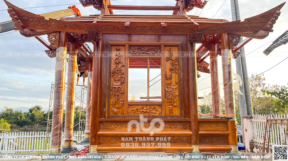 Ở các mặt bên, những bức tranh tứ bình cùng hoa văn cổ đồ được chạm khắc tinh tế, góp phần làm giàu thêm chiều sâu văn hóa và giá trị truyền thống cho ngôi lầu.