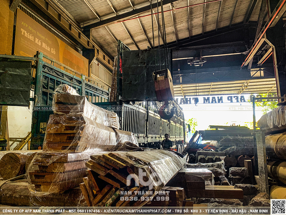 Việc bốc cấu kiện trở nên thuận lợi hơn nhờ hệ thống móc cẩu được trang bị sẵn tại xưởng gỗ. Người thợ điều khiển móc cẩu nâng từng cột gỗ, từng thanh xà với tải trọng lớn, đặt lên thùng xe một cách nhẹ nhàng và chuẩn xác, hạn chế tối đa va chạm trong quá trình vận chuyển.
