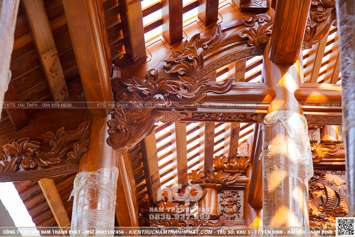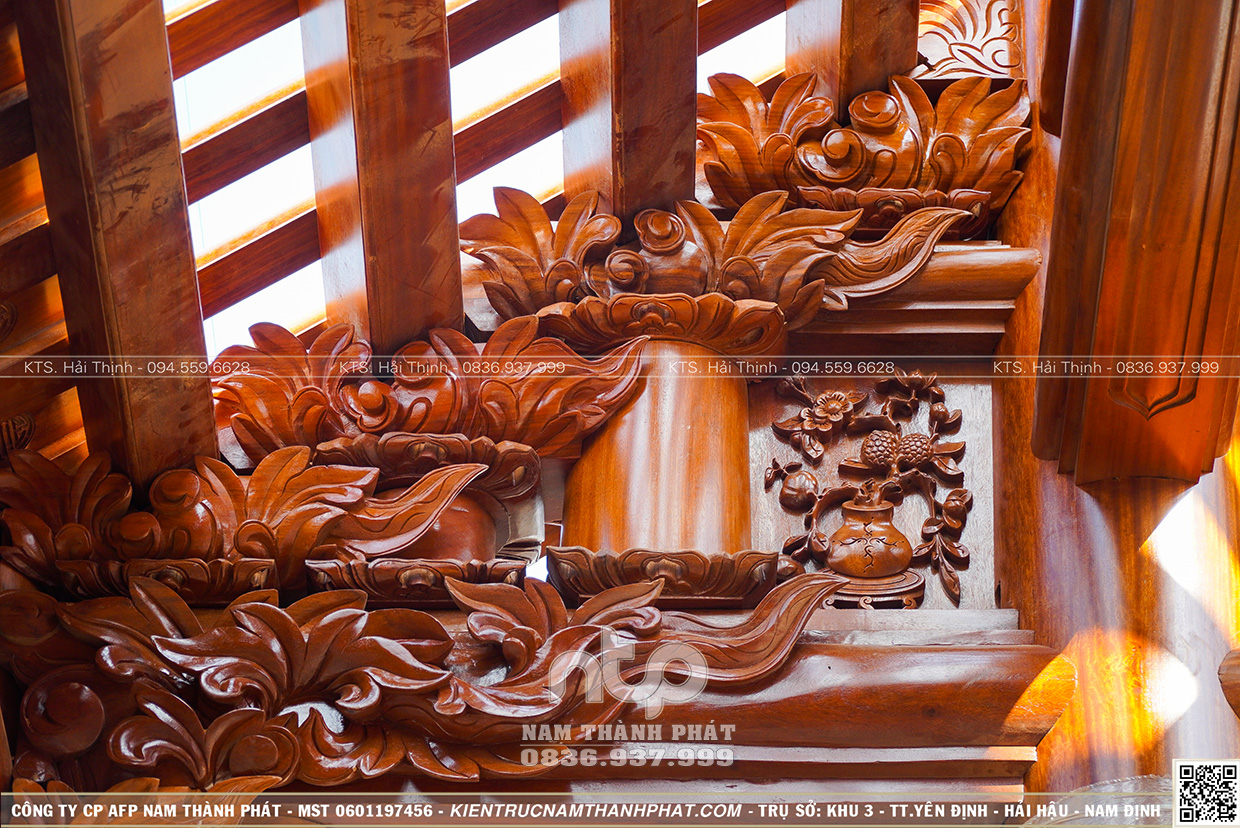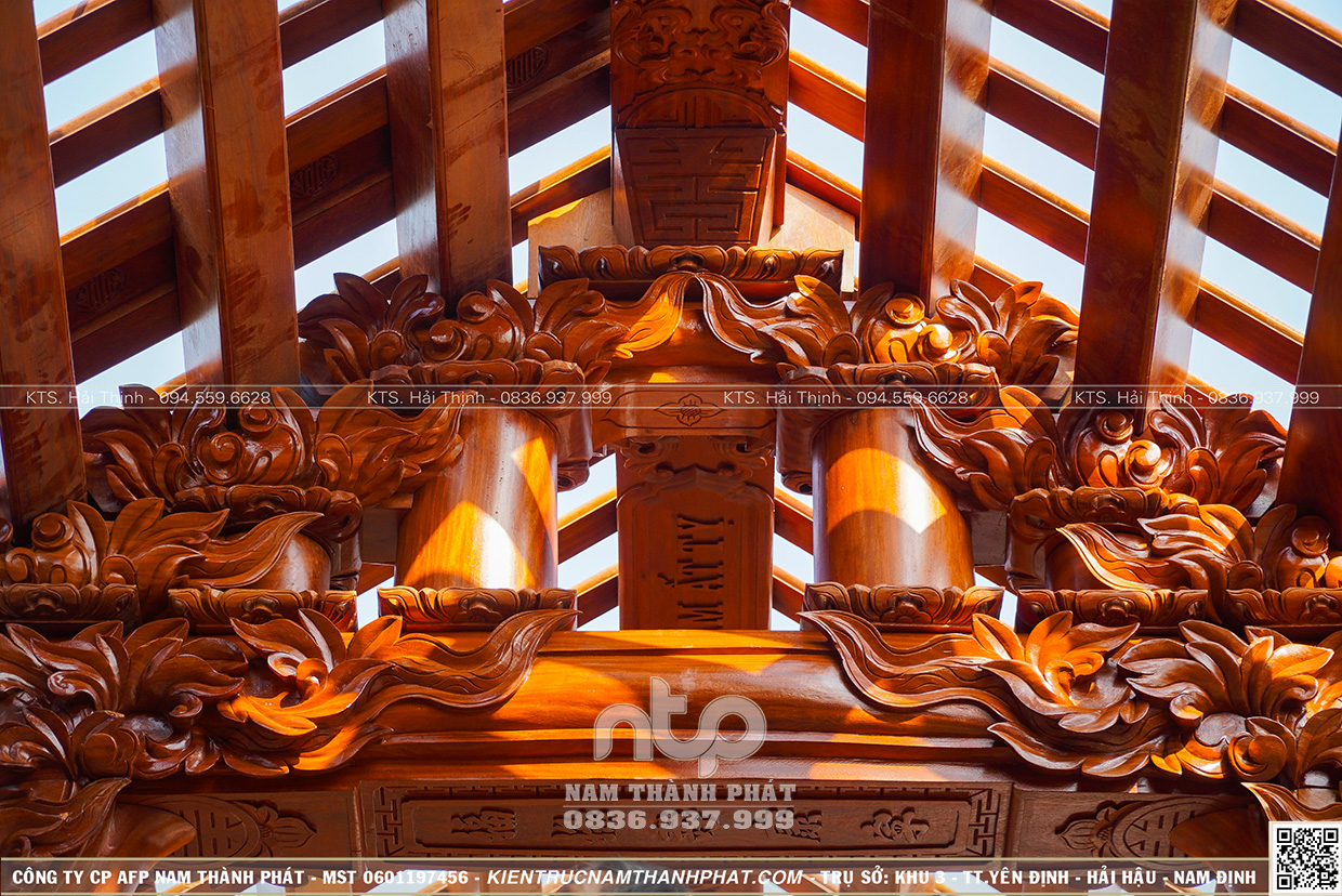 + Gồm 22 cột gỗ đứng đất (6 cột cái D35cm, 10 cột quân d32cm và 6 cột hiên D29cm)
