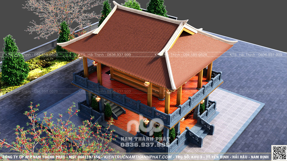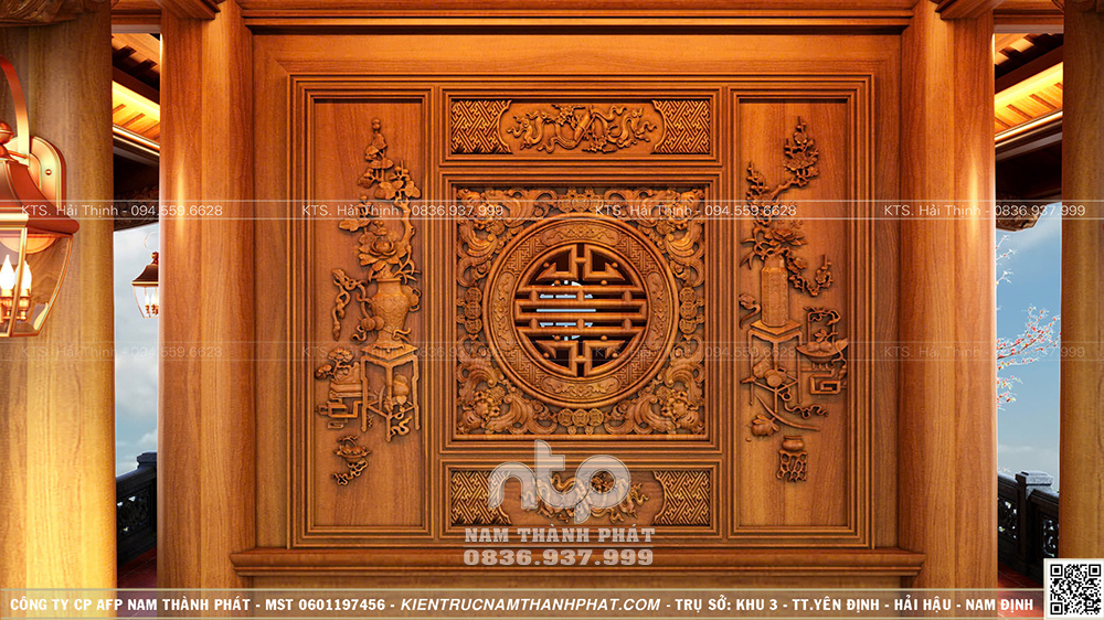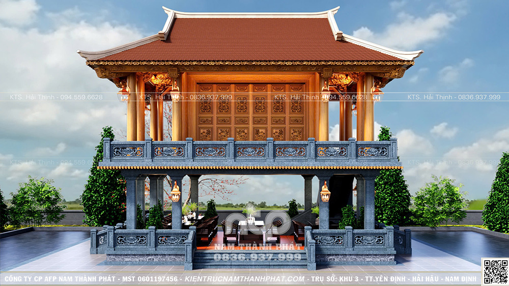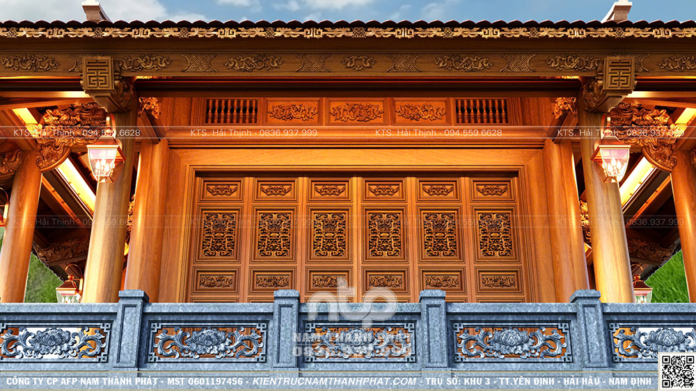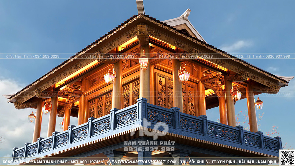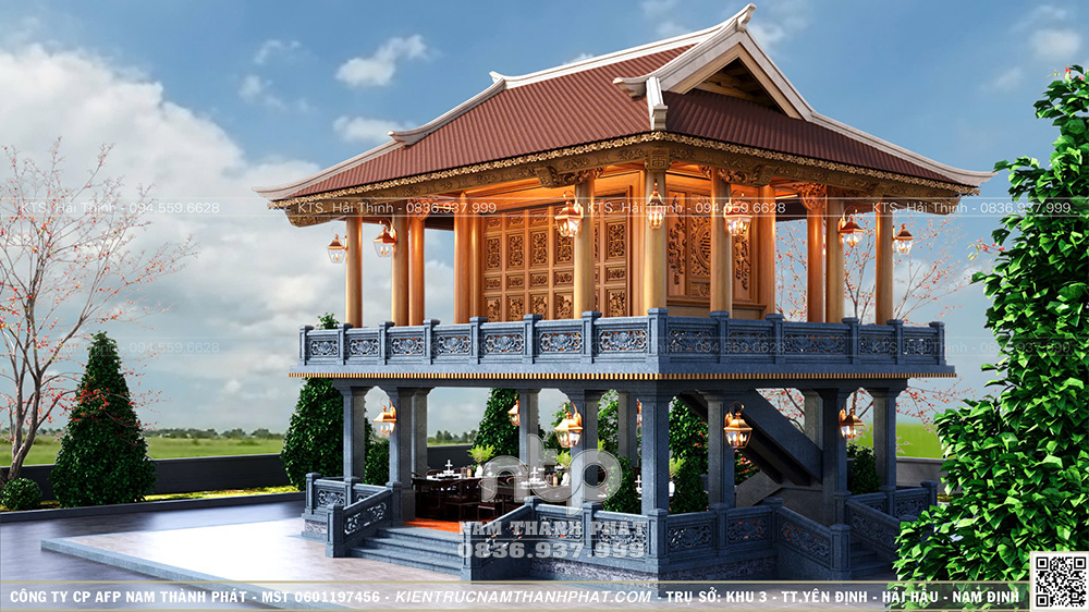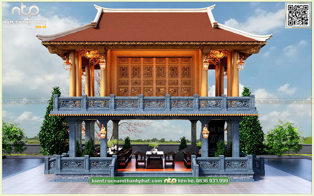 Trên tinh thần đó, Nam Thành Phát xin giới thiệu mẫu Lầu Quan Âm 1 gian đặt trên tầng 2, bên dưới là không gian sinh hoạt – tiếp khách, được tổ chức gọn gàng, nền nếp. Công trình nổi bật với hệ cửa bức bàn 6 cánh chạm khắc tinh xảo và tích hợp không gian tiếp khách dưới tầng 1.