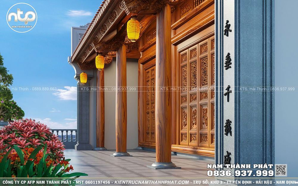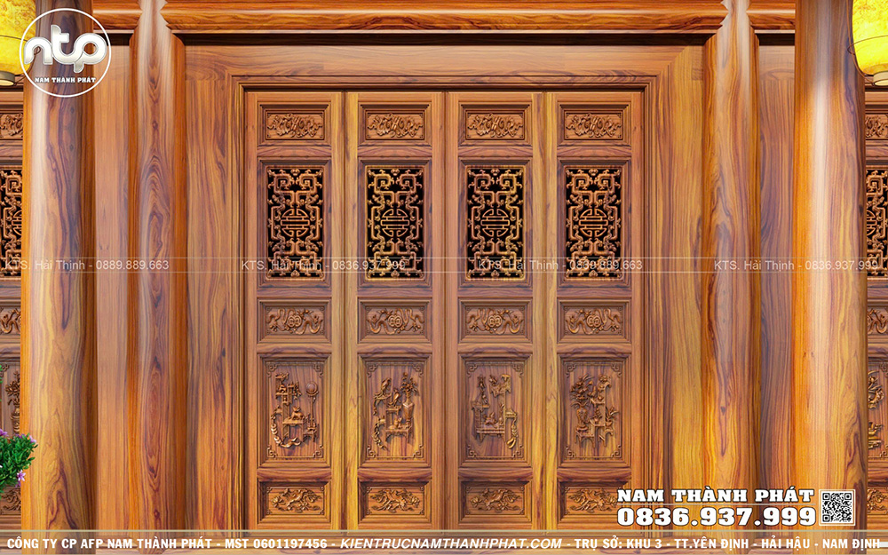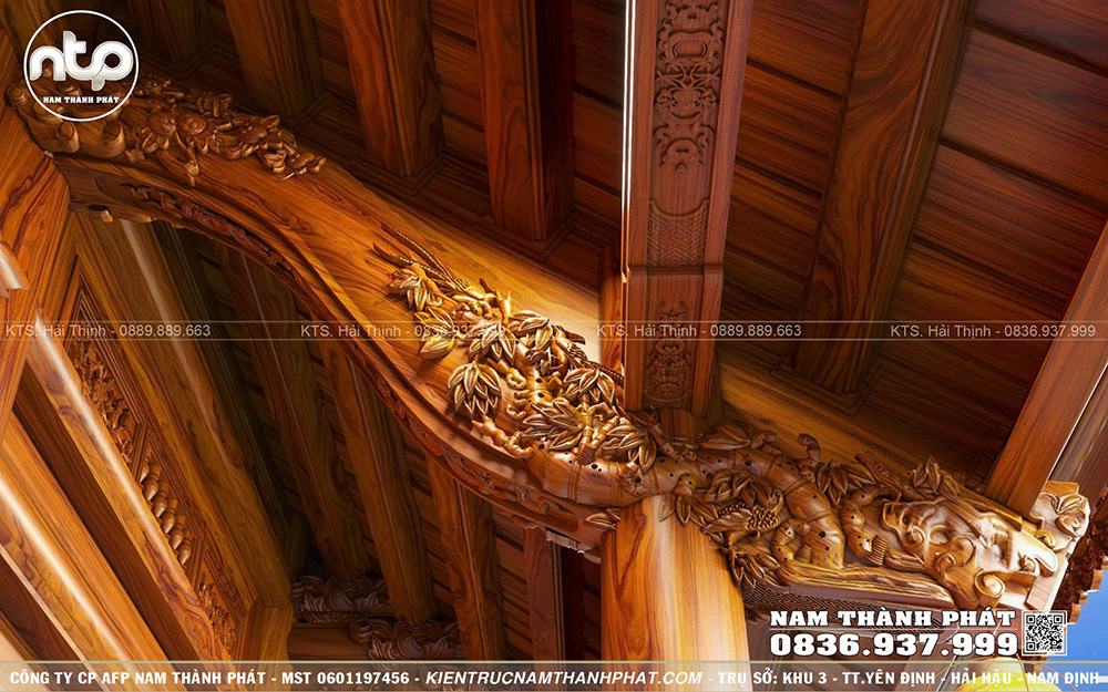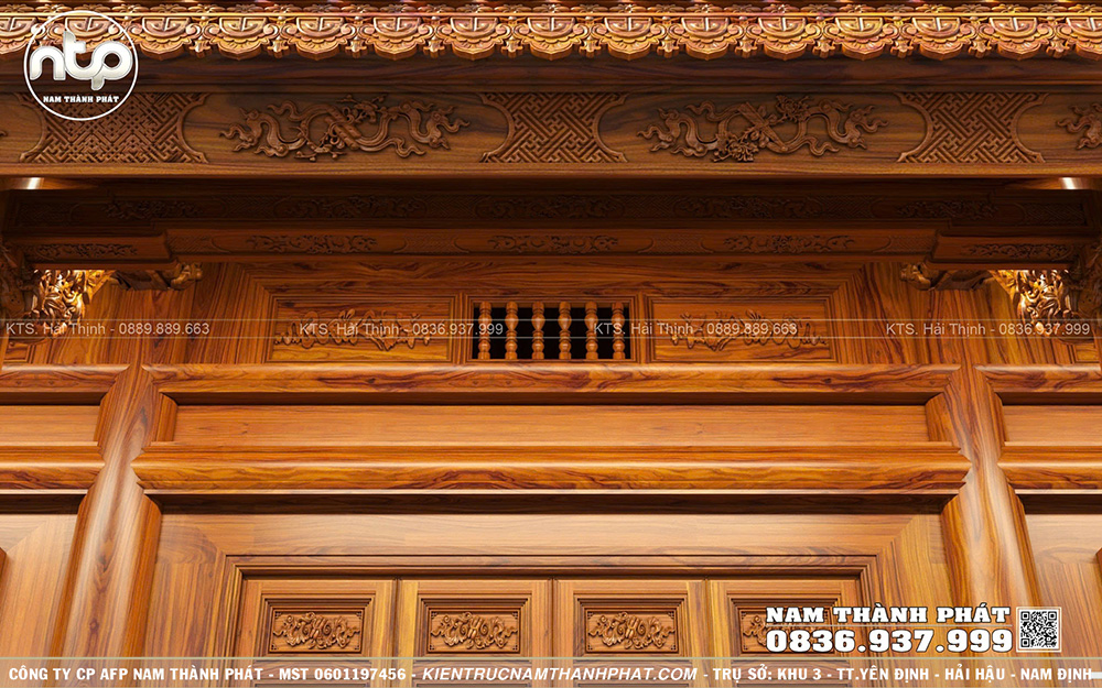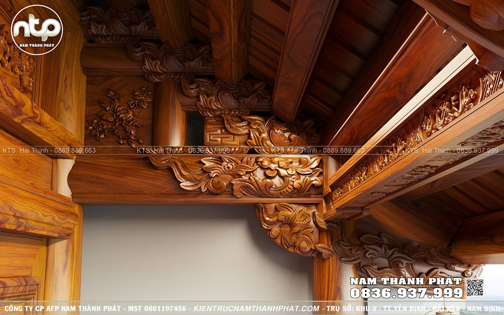 Tại Nam Thành Phát, tất cả hoa văn đều được chạm kênh bong sâu tạo hiệu ứng 3D sống động mà chân thực. Đây cũng chính là sự khác biệt tạo nên thương hiệu Nhà gỗ Nam Thành Phát. Phần mái hiên rộng được tô điểm bằng các chi tiết hoa văn cổ truyền. Các họa tiết trên kẻ hiên được đục khéo léo tôn lên vẻ thanh thoát và chiều sâu thẩm mỹ cho mặt tiền công trình.
