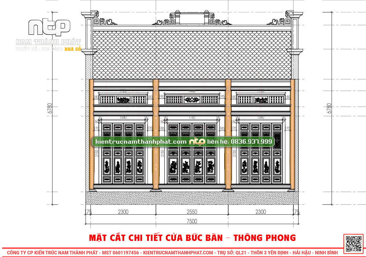 Trong bản vẽ kỹ thuật 2D, Nam Thành Phát sẽ cung cấp chi tiết các mặt đứng mắt cắt, hệ kết cấu đầy đủ cho gia chủ. Đây là một mặt cắt chi tiết thể hiện hệ cửa bức bàn kết hợp cùng ô thông phong phía trên giúp lưu thông không khí.