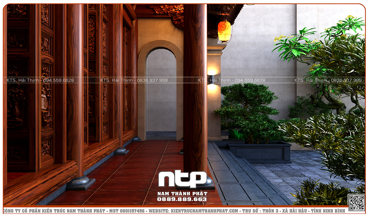 Khoảng hiên phía trước được thiết kế đủ rộng, không quá sâu nhưng cũng không hẹp, vừa tạo không gian chuyển tiếp, vừa là nơi dừng chân trước khi bước vào khu vực thờ tự.