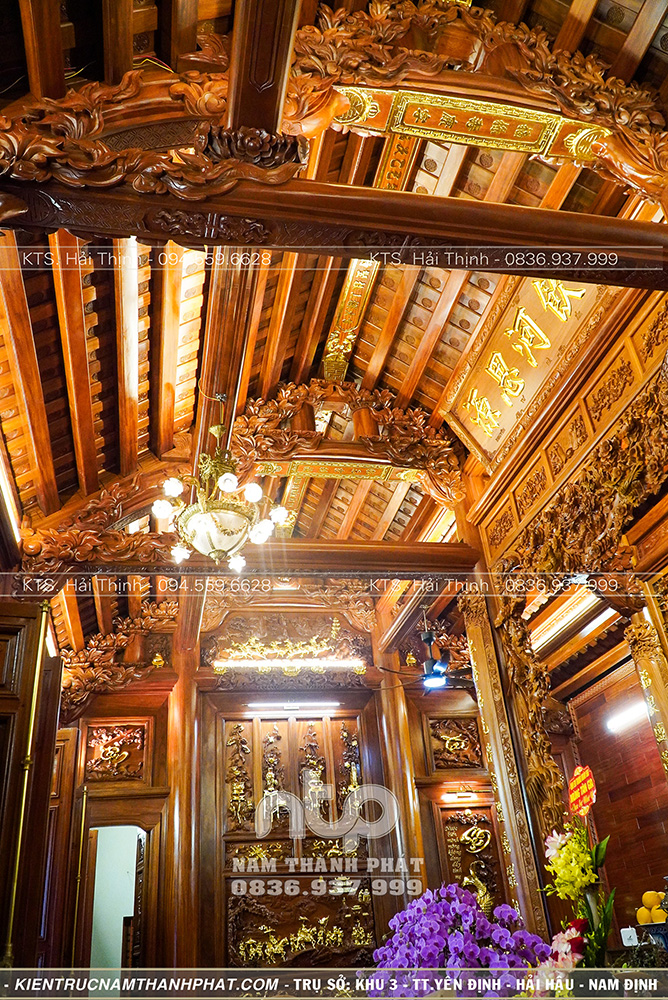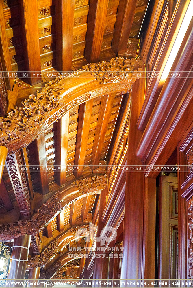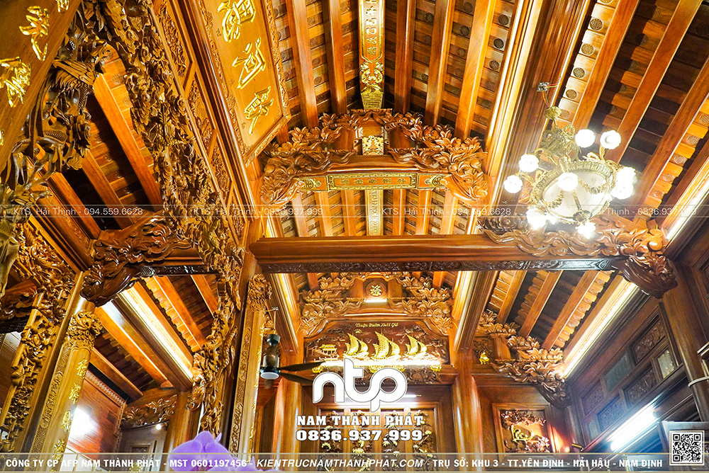 Ngước nhìn lên cao, quý vị sẽ thấy hệ thống vì kèo khung gỗ vô cùng chắc chắn và bề thế. Đây chính là niềm tự hào của đội ngũ thợ mộc Nam Thành Phát.