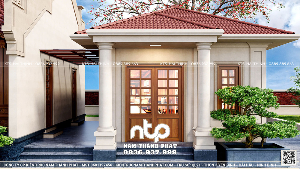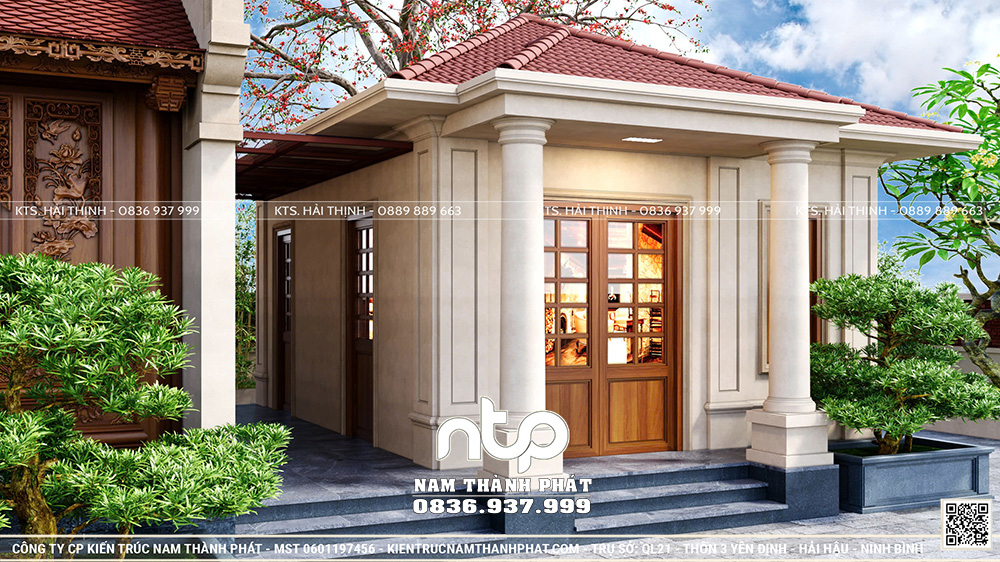 Ngôi nhà chính được thiết kế theo loại hình nhà gỗ 5 gian 2 mái cổ truyền Bắc Bộ. Điểm nhấn nằm ở 2 buồng ngủ lồi ra phần hiên, một giải pháp kiến trúc quen thuộc trong nhà gỗ truyền thống. Nam Thành Phát thiết kế đảm bảo giúp hai gian ngoài cùng không bị hắt mưa, đồng thời tạo thêm không gian riêng tư phục vụ sinh hoạt của gia chủ.