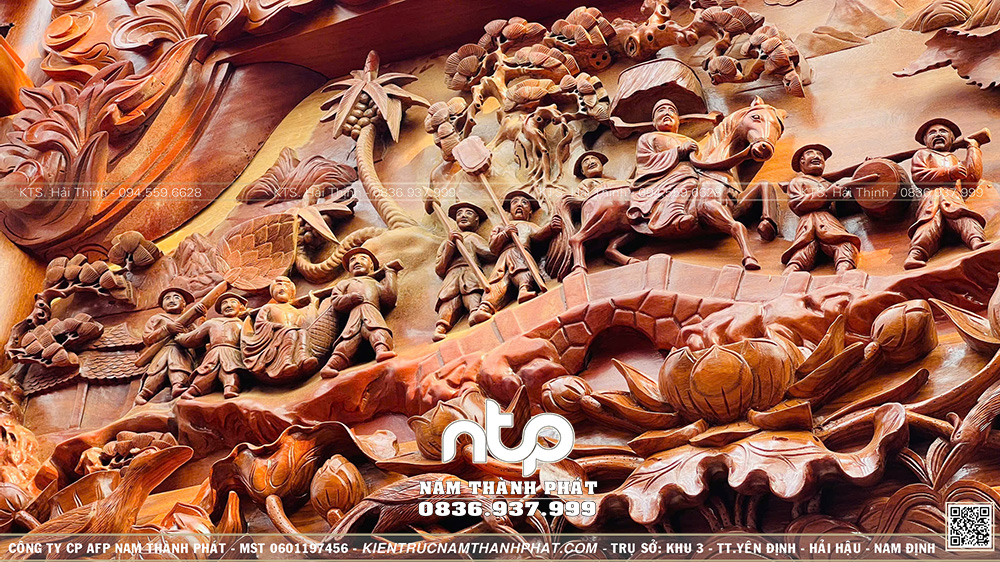 Cuốn thư thường được đặt ở vị trí cao nhất trên vì thuận, ngay trung tâm bộ tranh để tạo điểm nhấn thẩm mỹ và cân đối tổng thể. Tại Nam Thành Phát, cuốn thư được chạm nổi tinh xảo, khắc các chữ Hán Nôm mang ý nghĩa sâu sắc như "Đức Lưu Quang", "Phúc Mãn Đường", biểu trưng cho đạo đức, phúc lành và sự thịnh vượng của gia chủ. Chữ được đục nổi, đường viền rõ nét, độ sâu vừa phải để khi ánh sáng chiếu vào, các nét chạm hiện lên có chiều sâu và trang nghiêm.