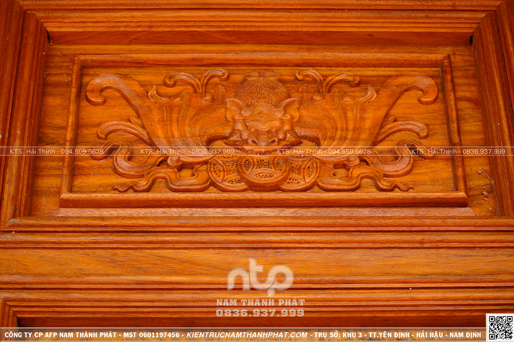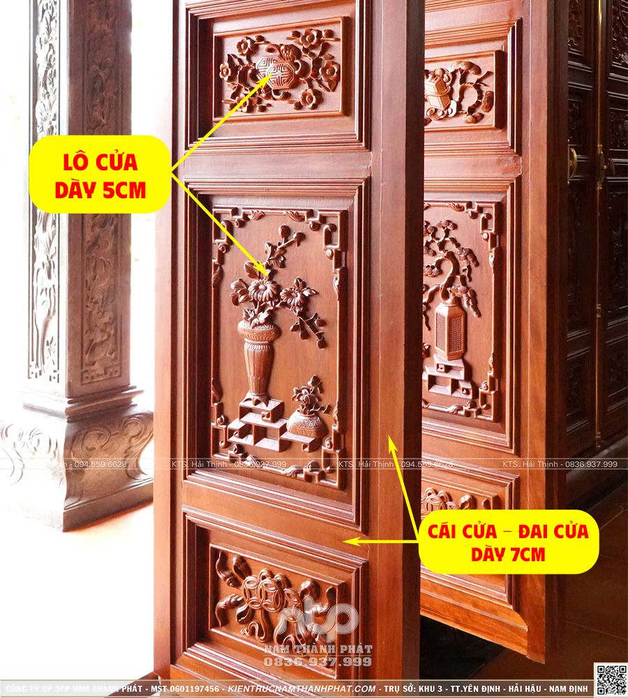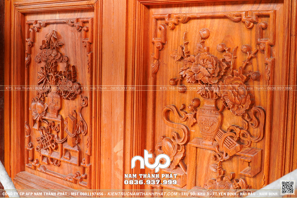 Cửa bức bàn được Nam Thành Phát chế tác thi công với hoạ tiết sắc nét tỷ mỉ! Cái cửa (2 cạnh dọc ở lô), đai cửa (2 thanh ngang ở lô) dày 7cm soi chỉ kép liền không chắp. Lô cửa (ô pano) dày 5cm, được đục tinh xảo cả hai mặt, tạo nên độ chắc chắn và nét đẹp hài hòa.