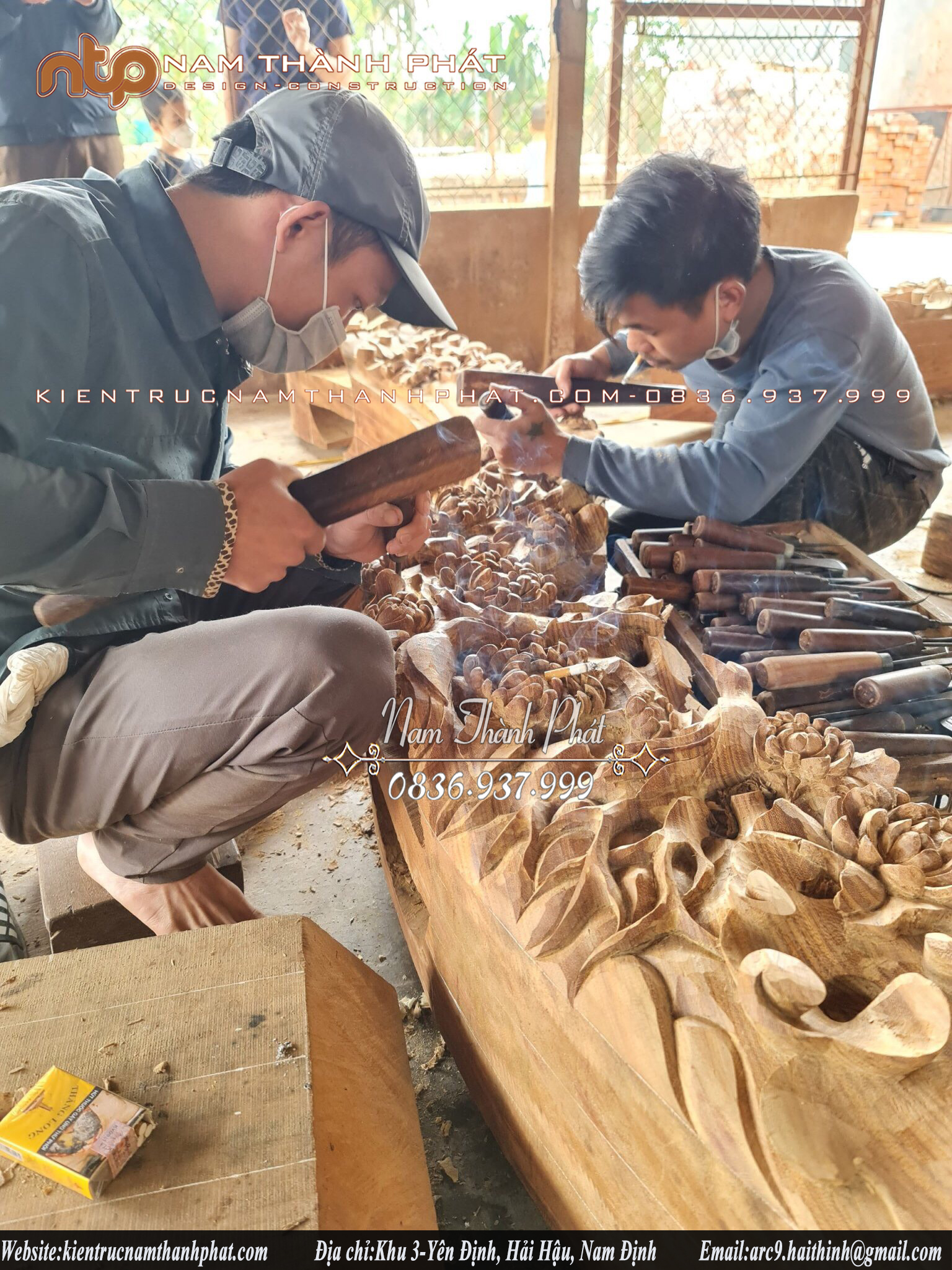 Tại Xưởng Nhà Gỗ Nam Thành Phát, toàn bộ hoa văn được chạm thủ công bằng tay bởi những người thợ dày kinh nghiệm. Mỗi nhát đục, nét chạm đều được canh chuẩn, vừa có độ nổi rõ, vừa giữ được sự mềm mại của đường cong.