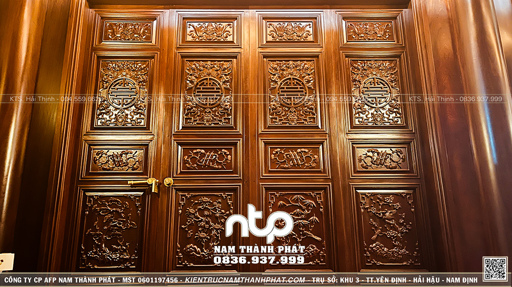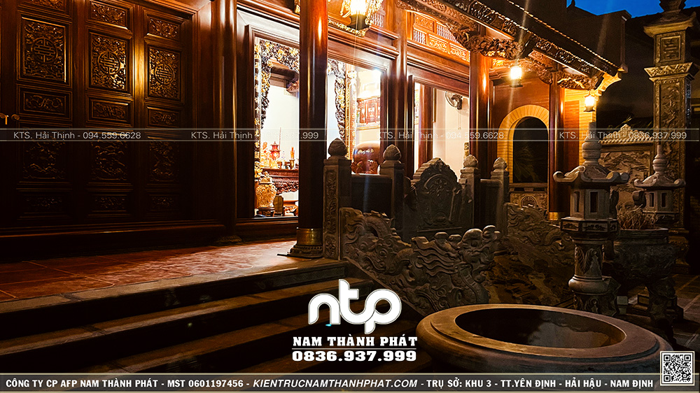 Ban ngày, công trình mang dáng vẻ uy nghi, chuẩn mực. Nhưng khi đêm buông, ánh đèn vàng len qua từng khe cửa bức bàn, hắt lên vân gỗ… lúc ấy, ngôi nhà mới thực sự “lên hồn”.
