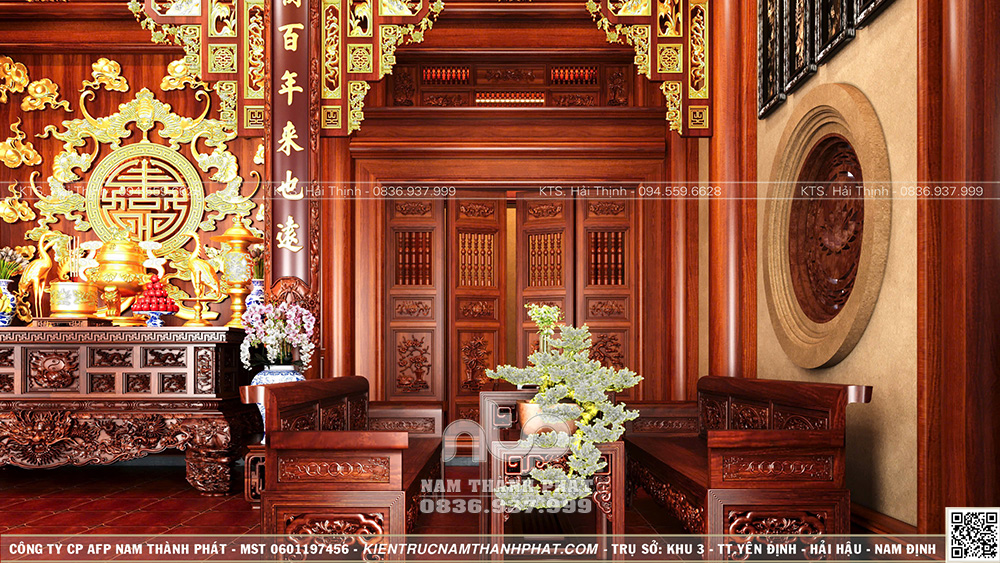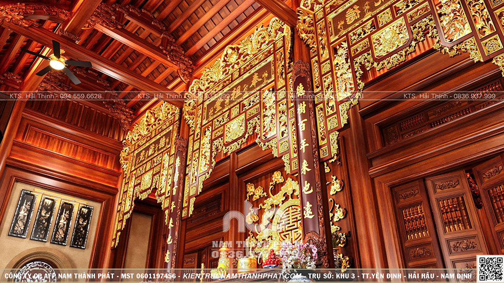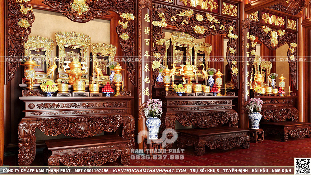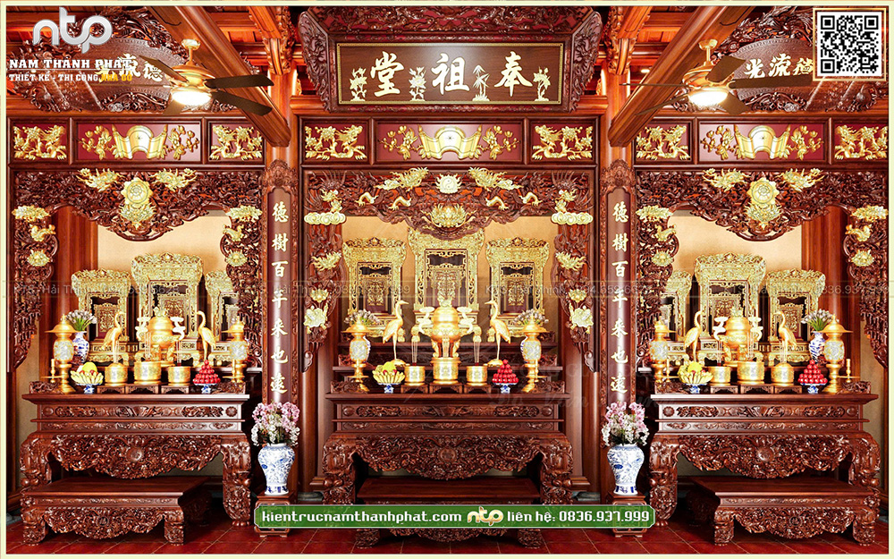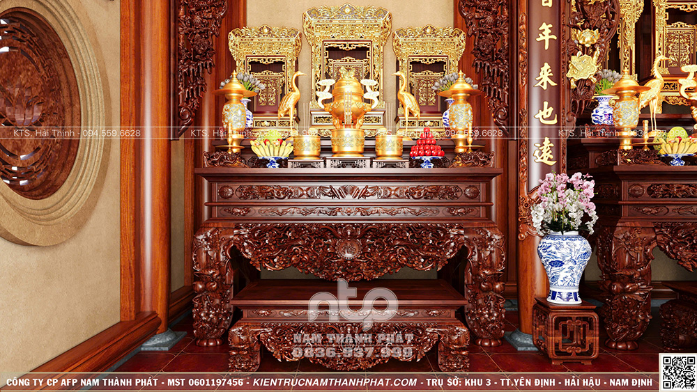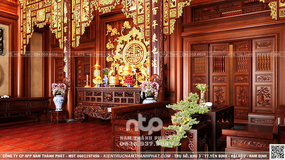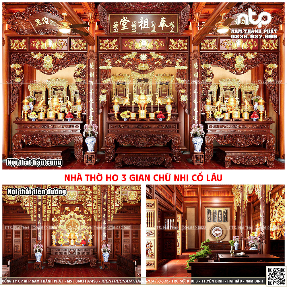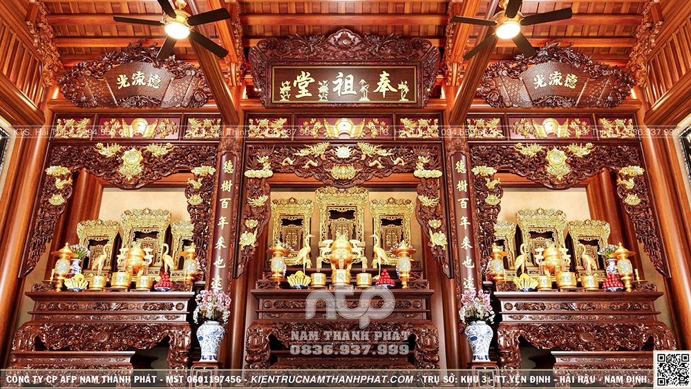 Trên nền tảng những giá trị di sản ấy, Nam Thành Phát xin giới thiệu mẫu nội thất nhà thờ họ 3 gian chữ Nhị, được tổ chức mạch lạc với tiền đường rộng mở và hậu cung khép kín, vừa đảm bảo sự trang nghiêm trong nghi lễ, vừa tạo chiều sâu tâm linh cho toàn bộ công trình. Mỗi chi tiết chạm khắc, mỗi lớp không gian đều được tiết chế và cân nhắc kỹ lưỡng, góp phần gìn giữ nếp thờ truyền thống và khát vọng hưng thịnh của dòng họ qua nhiều thế hệ.