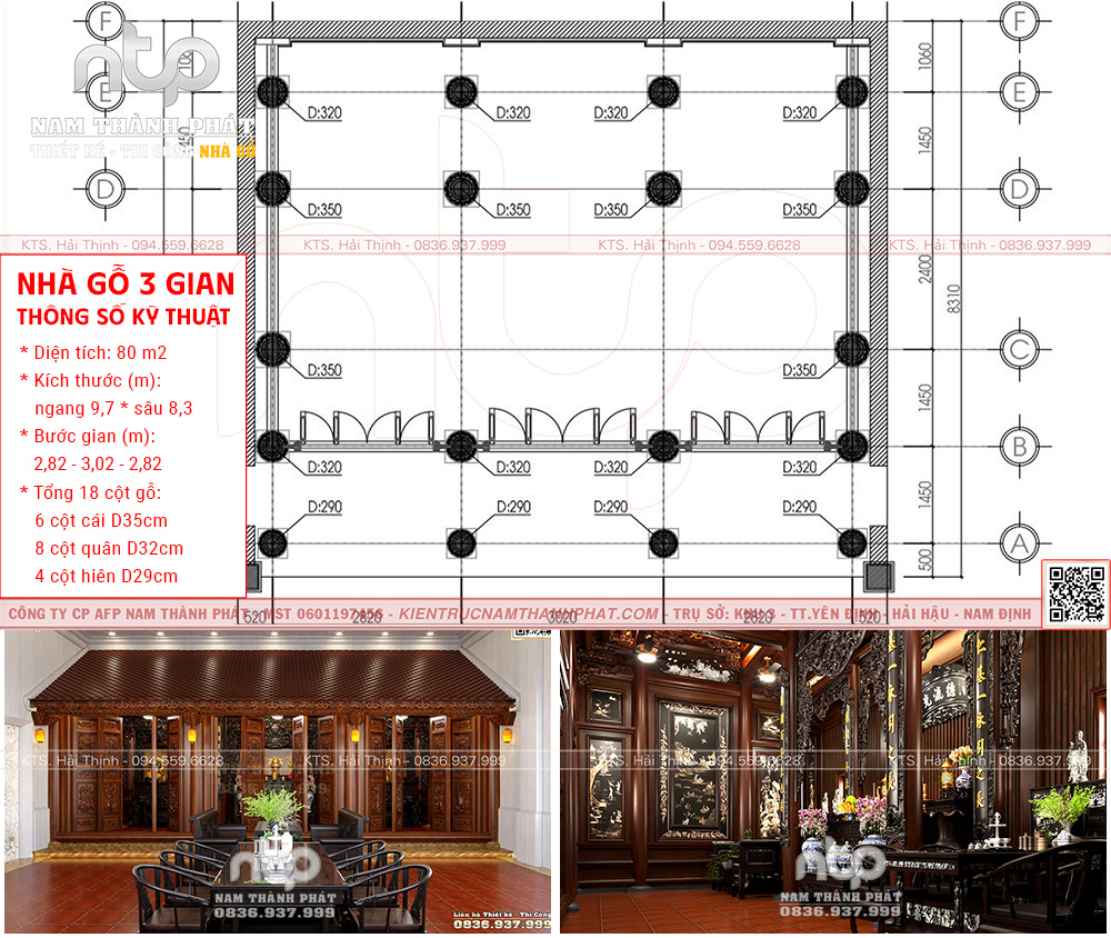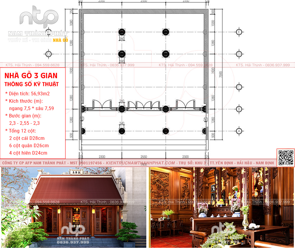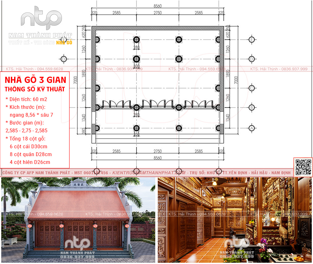 Mẫu nội thất nhà gỗ 3 gian này được thiết kế dựa trên tỉ lệ vàng trong kiến trúc cổ truyền Bắc Bộ, kết hợp kỹ thuật chế tác gỗ lim Nam Thành Phát đạt đến độ hoàn mỹ.. Được bài trí trong không gian có diện tích 56,93m², kích thước ngang 7,5m – sâu 7,59m, với 6 cột cái đường kính D28cm và hệ cột hiên D24cm, tạo nên khung kết cấu chắc khỏe và bền vững.