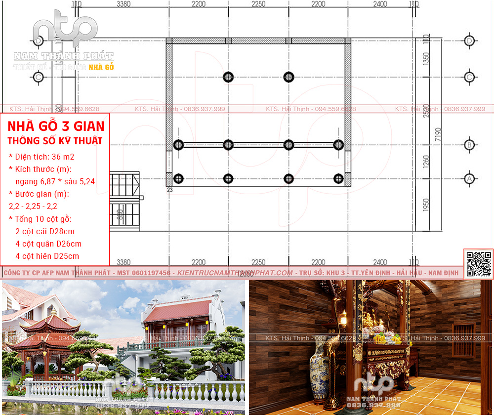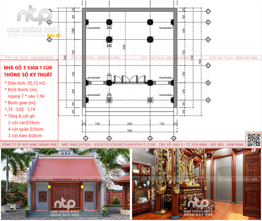 Một thiết kế mang tính biến thể sáng tạo trong kiến trúc cổ truyền, được Nam Thành Phát thực hiện trên diện tích 55,72m², với bước gian 1.74 – 3.02 – 1.74m. Cấu trúc này tạo nên tỷ lệ cân đối, hài hòa, giữ được nét trang nghiêm cổ điển nhưng vẫn linh hoạt trong sử dụng thực tế.