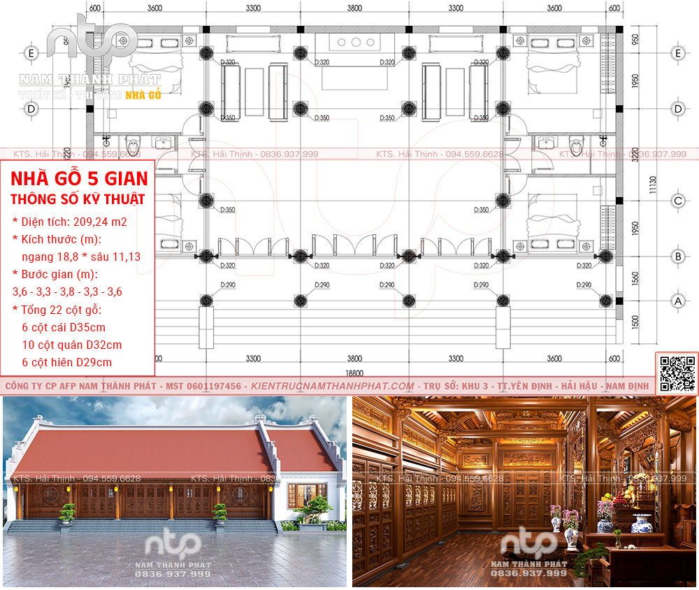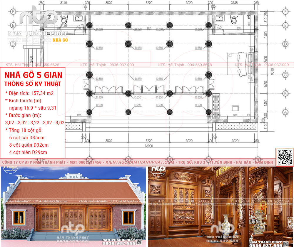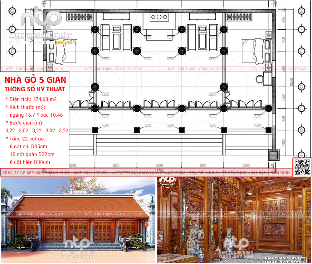Mẫu nội thất nhà gỗ 5 gian này hiện lên uy nghi mà gần gũi, là minh chứng rõ ràng cho tay nghề và tư duy thẩm mỹ của người thợ mộc Nam Thành Phát. Căn nhà có diện tích 174,68m², bố cục theo bước gian 3.22 – 3.02 – 3.22 – 3.02 – 3.22m, cân đối, hài hòa, đảm bảo tỷ lệ vàng trong kiến trúc truyền thống.