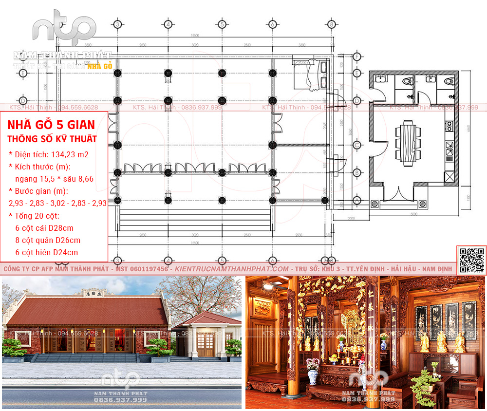 Mẫu nội thất nhà gỗ 5 gian này là một công trình tiêu biểu cho phong cách nhà gỗ cổ truyền bề thế, với tổng diện tích 134,23m², bước gian chuẩn mực: 2.93 – 2.83 – 3.02 – 2.83 – 2.93m. Toàn bộ công trình được Nam Thành Phát thiết kế và hoàn thiện trong khối nhà 5 gian 2 buồng lồi, liền kề nhà ngang phụ trợ, tạo nên tổng thể hài hòa, vừa có tính thẩm mỹ, vừa thuận tiện trong sinh hoạt gia đình ba thế hệ.
