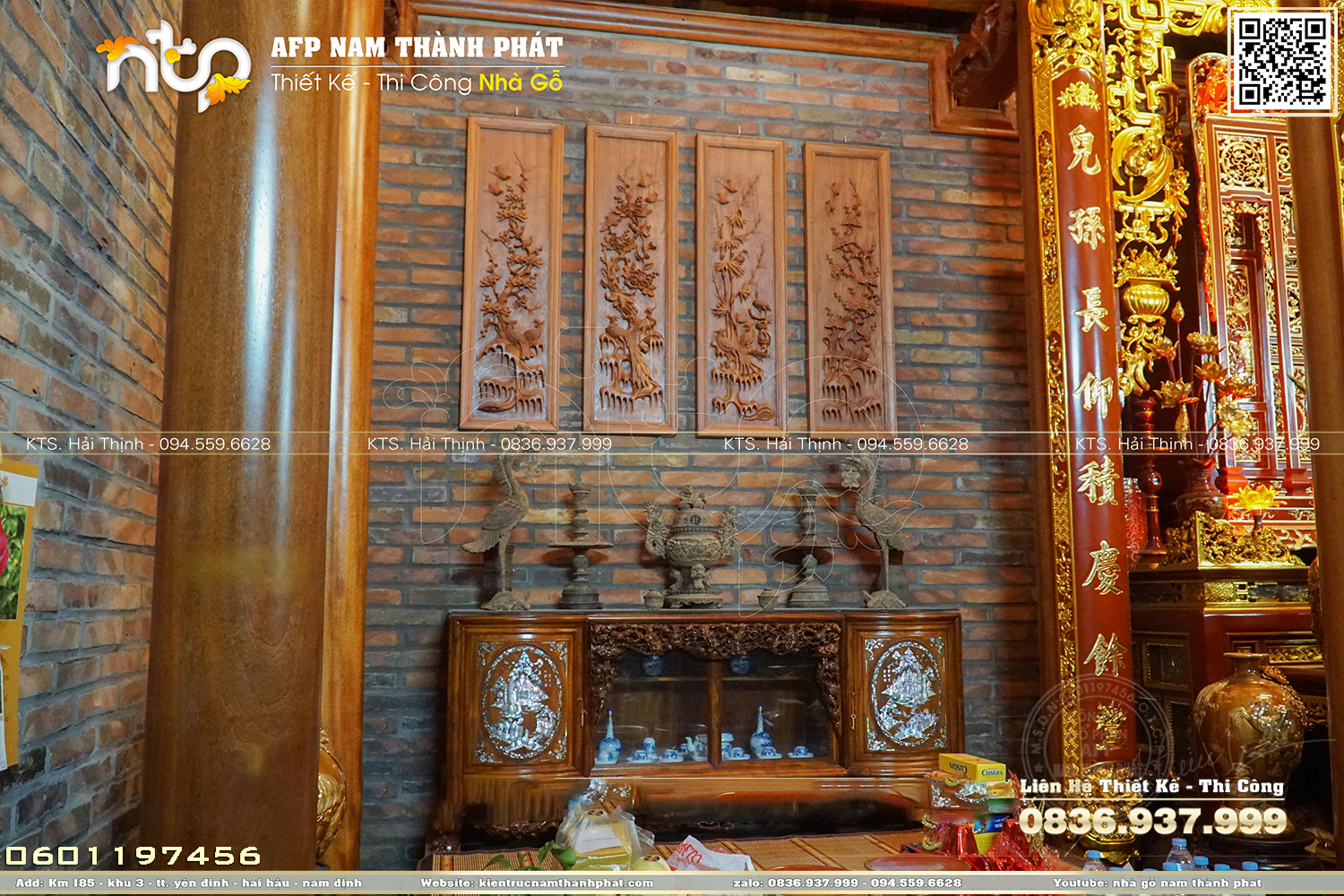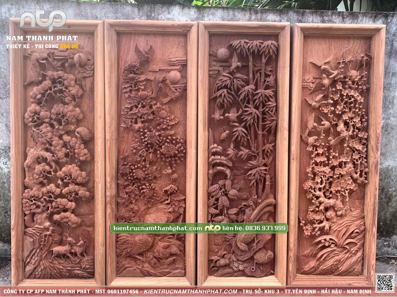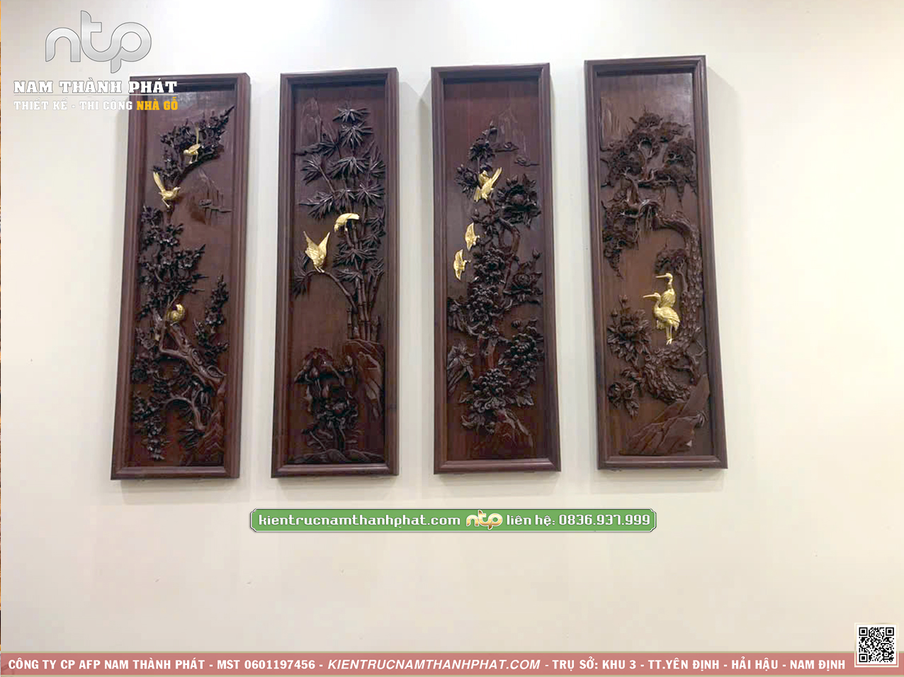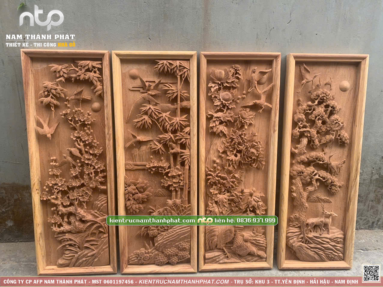 Trong nếp nhà gỗ cổ truyền, bộ tranh gỗ Tứ Quý hiện diện như một dấu ấn sang trọng, vừa mang giá trị nghệ thuật, vừa gắn liền với phong thủy. Những đường chạm khắc kênh bong tinh xảo không chỉ làm đẹp không gian mà còn khẳng định tay nghề bậc thầy của những người thợ mộc Việt nói chung và của Nam Thành Phát nới riêng.