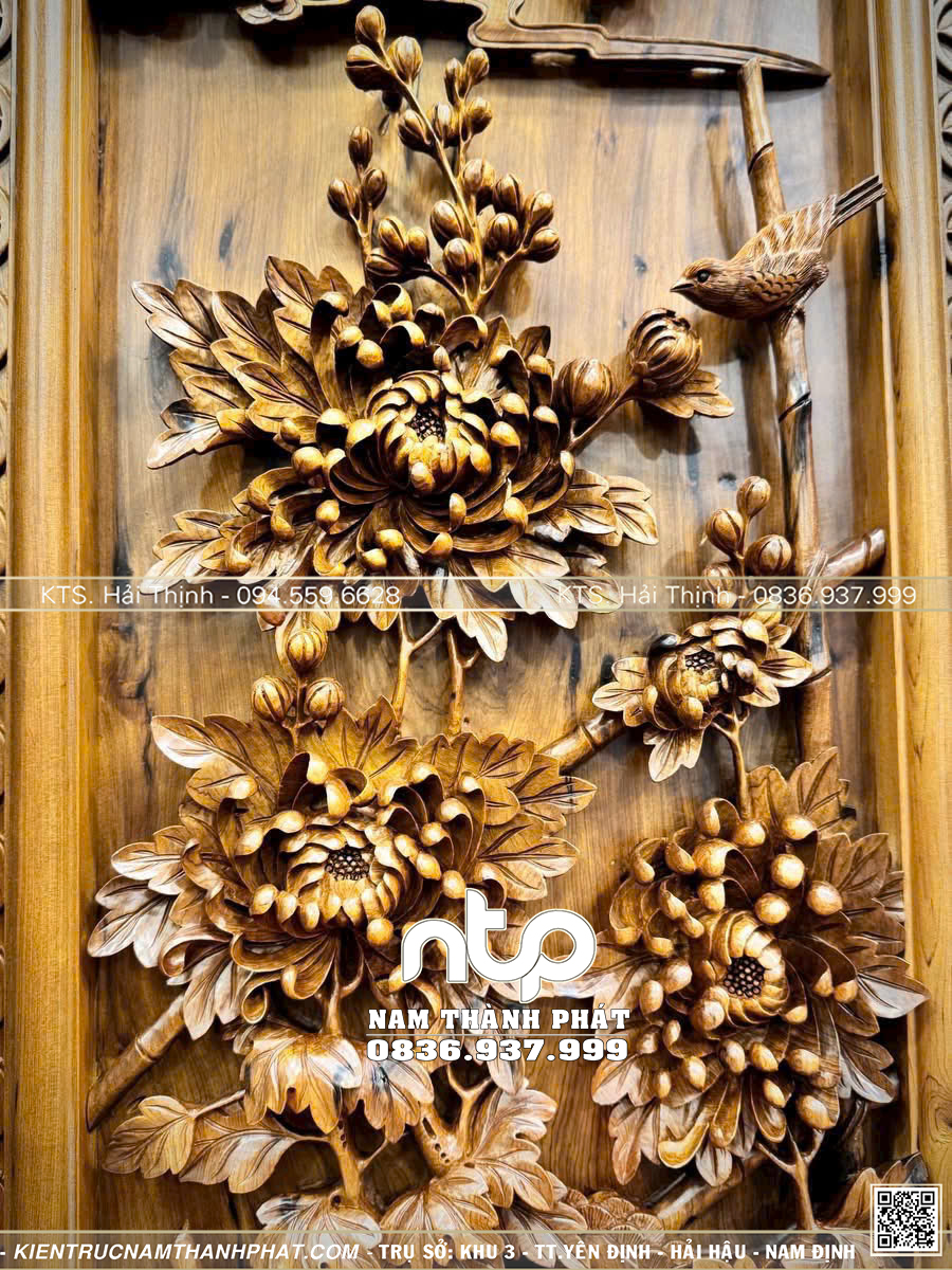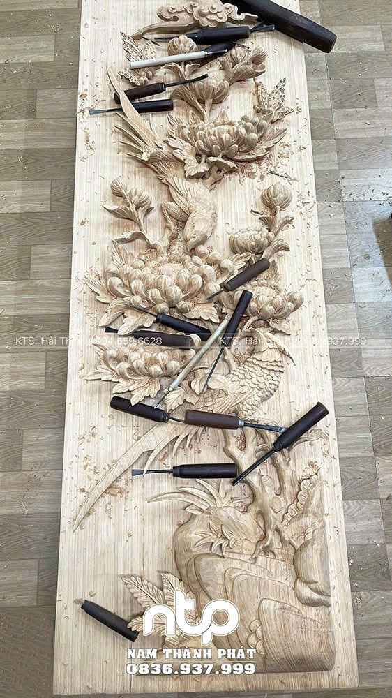 Nhờ kỹ nghệ chạm nổi, kênh bong của nghệ nhân, từng gân lá, cánh hoa “bắt sáng” trên nền gỗ, tạo chiều sâu sống động – cảm xúc thẩm mỹ gắn liền với niềm tự hào về tay nghề nghệ nhân.