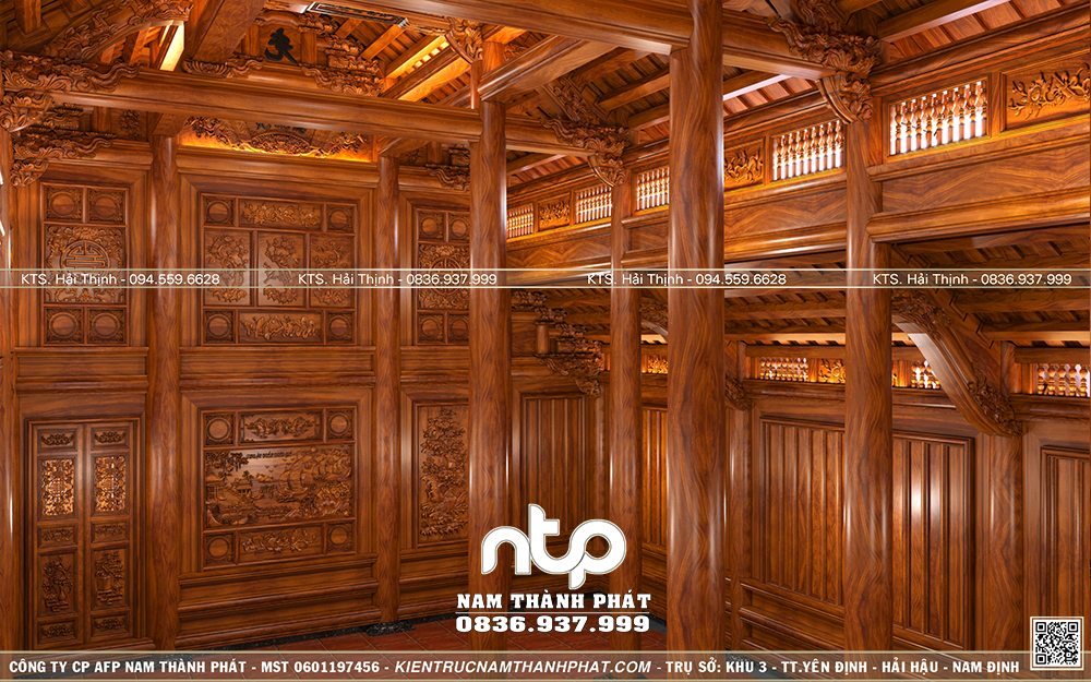 Vách thuận trong mẫu nhà này giống như một bức bình phong vừa giúp phân định không gian vừa giữ nhịp cho toàn bộ khung nhà. Các mảng pano vách thuận được căn chỉnh theo nhịp cột, tạo cảm giác đều đặn, trang nghiêm, không rối mắt dù mật độ chạm khắc dày.