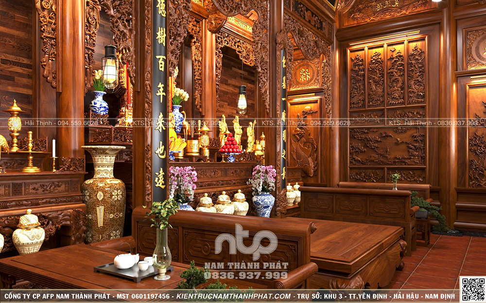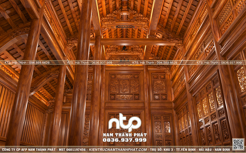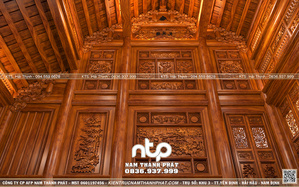 - Bố trí hài hoà tổng thể: Vách thuận cần được tính toán đồng bộ với hệ cột, vì kèo tránh tình trạng vách “lấn át” không gian hoặc che khuất trục chính của gian giữa – nơi giữ vai trò tâm linh quan trọng.