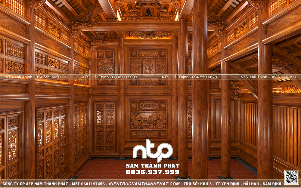 Toàn bộ không gian nội thất thiên về chạm khắc hoa văn cổ truyền kết hợp cửa sổ chữ Thọ cùng các bức tranh vuông lớn, bố cục cân xứng hai bên. Căn nhà khá lớn nên hệ cột cũng khá cao kết hợp thông phong con tiện tạo không gian mở thoáng đãng.